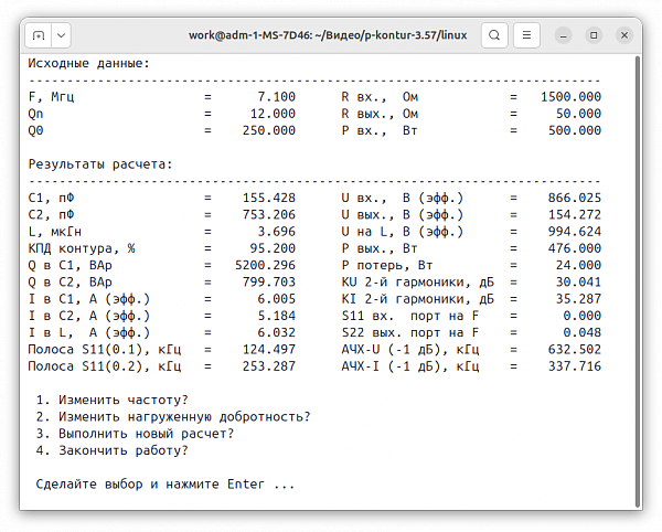 Программу можно использовать для расчета согласующего П-контура или выходного П-контура передатчика. Программой производится расчет элементов контура, КПД, потерь, реактивных мощностей и токов в его элементах, напряжений, модулей параметров S11 и S22 на рабочей частоте, полосы частот по модулю S11 для уровней 0.1 и 0.2, подавления 2-й гармоники в режимах генератора напряжения и генератора тока, а также полосы пропускания по уровню -1 дБ. Для расчета усилителя мощности приложены графики разложения токового импульса для линейной и квадратичной характеристик ламп.