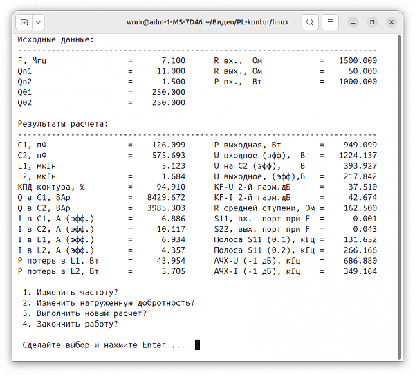 В Linux версии (1.77) программы добавлено уточнение элементов второго контура (Г-звена) численным методом для получения параметра S11 ПL-контура практически равным нулю (не хуже одной тысячной). Если доберутся руки сделаю и для винды, нужно лишь скомпилировать готовый код. Хотя в принципе это не обязательно, S11 и без того получается очень маленьким, а разница по элементам С2 и L2, между версиями 1.75 и 1.77, не превышает величины 1-1,5%. Такое уточнение более нужно для абсолютной точности расчета по входному сопротивлению и продиктовано обычным перфекционизмом :), но практически с расчетной точностью реальные элементы (емкости и индуктивности) все равно сделать невозможно. Сейчас в архиве лежит версия 1.75 для windows и 1.77 для Linux.